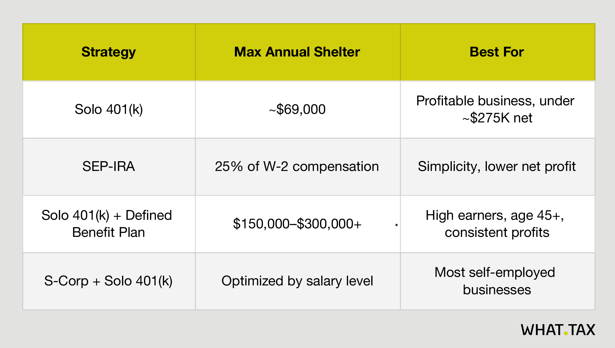 The SEP-IRA is simpler to set up but is limited to the employer-side 25% contribution, with no employee deferral. At the same $100,000 salary, a SEP-IRA caps contributions at $25,000. The Solo 401(k) gets you nearly double. If you’re using a SEP-IRA out of habit, ask your accountant to run the numbers.