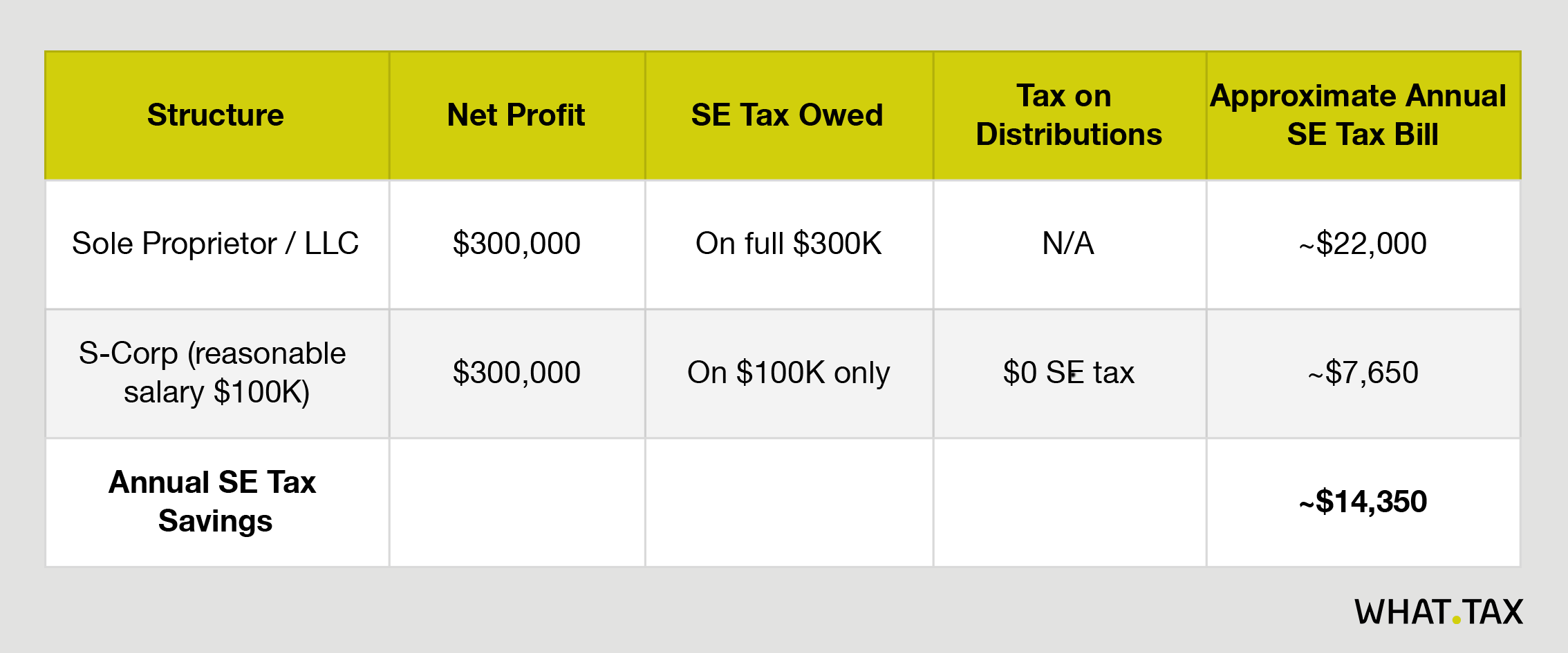 The S-Corp election doesn’t eliminate this tax. It shrinks the base it applies to. The structure requires you to pay yourself a “reasonable salary”, subject to payroll taxes, and take the rest as a distribution that bypasses self-employment tax entirely. On $300,000 of net profit, a reasonable salary might be $100,000. You pay payroll taxes on $100,000 and pocket $200,000 as a distribution free of SE tax. That’s roughly $18,000 in annual savings that you can redirect into investments instead.